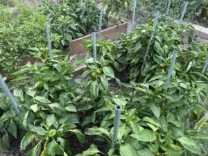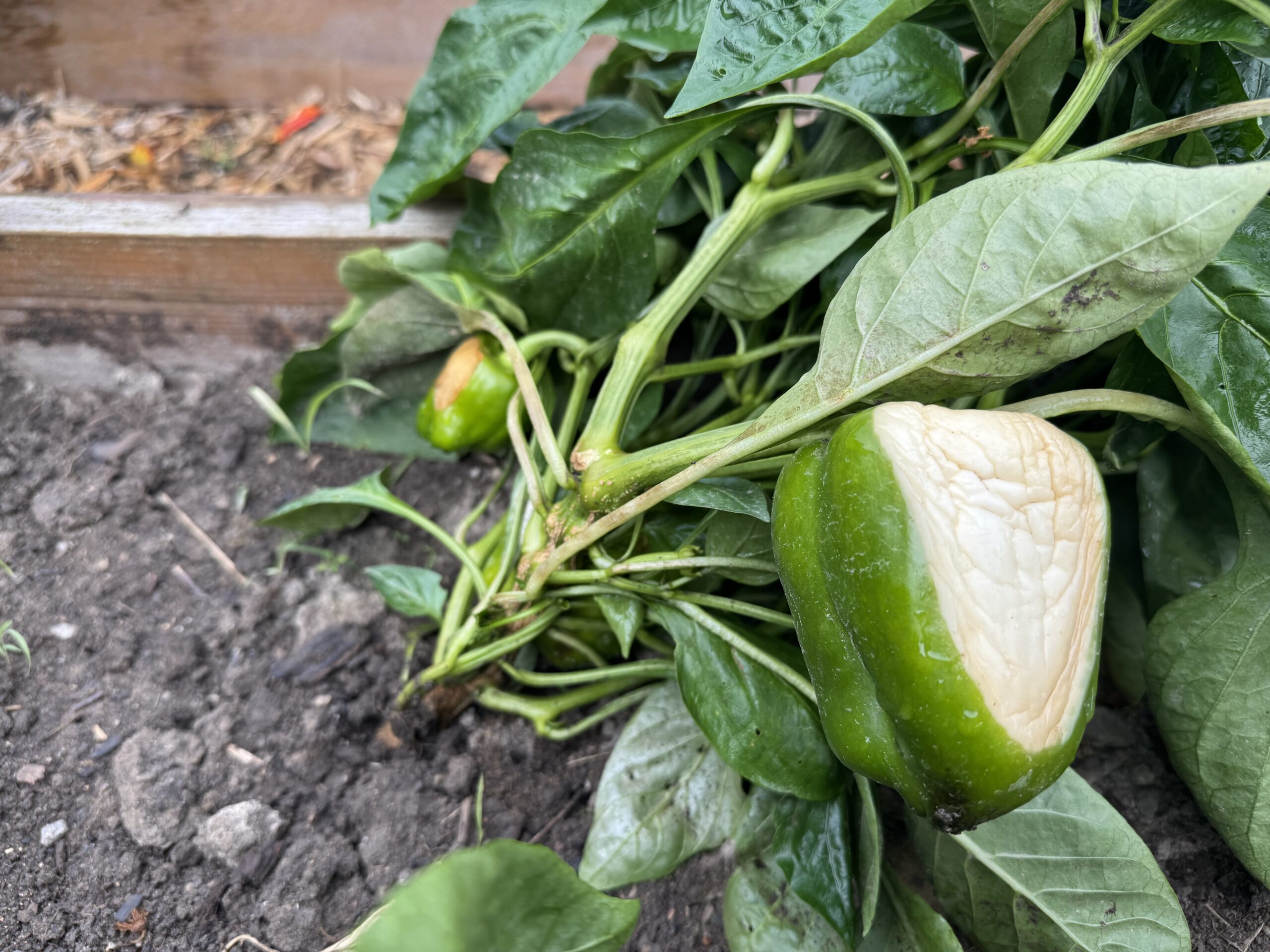 Sunscald is more of a problem in June and July when there is unobstructed mid-day sun, the fruits are immature, and the protective leaf canopy hasn’t grown out enough to shade the fruits. I rarely see it on my mature plants in late August and September when the sun is lower in the sky (even though it’s still quite hot) and the leaves have filled out to protect the fruits. Be cognizant of the sun when you’re considering which beds will be in shade at different times of the day—younger, thicker skinned peppers, especially those at the bottom of the plant that get the strong sun on the south and west side of the plant are the most susceptible to sunscald.
